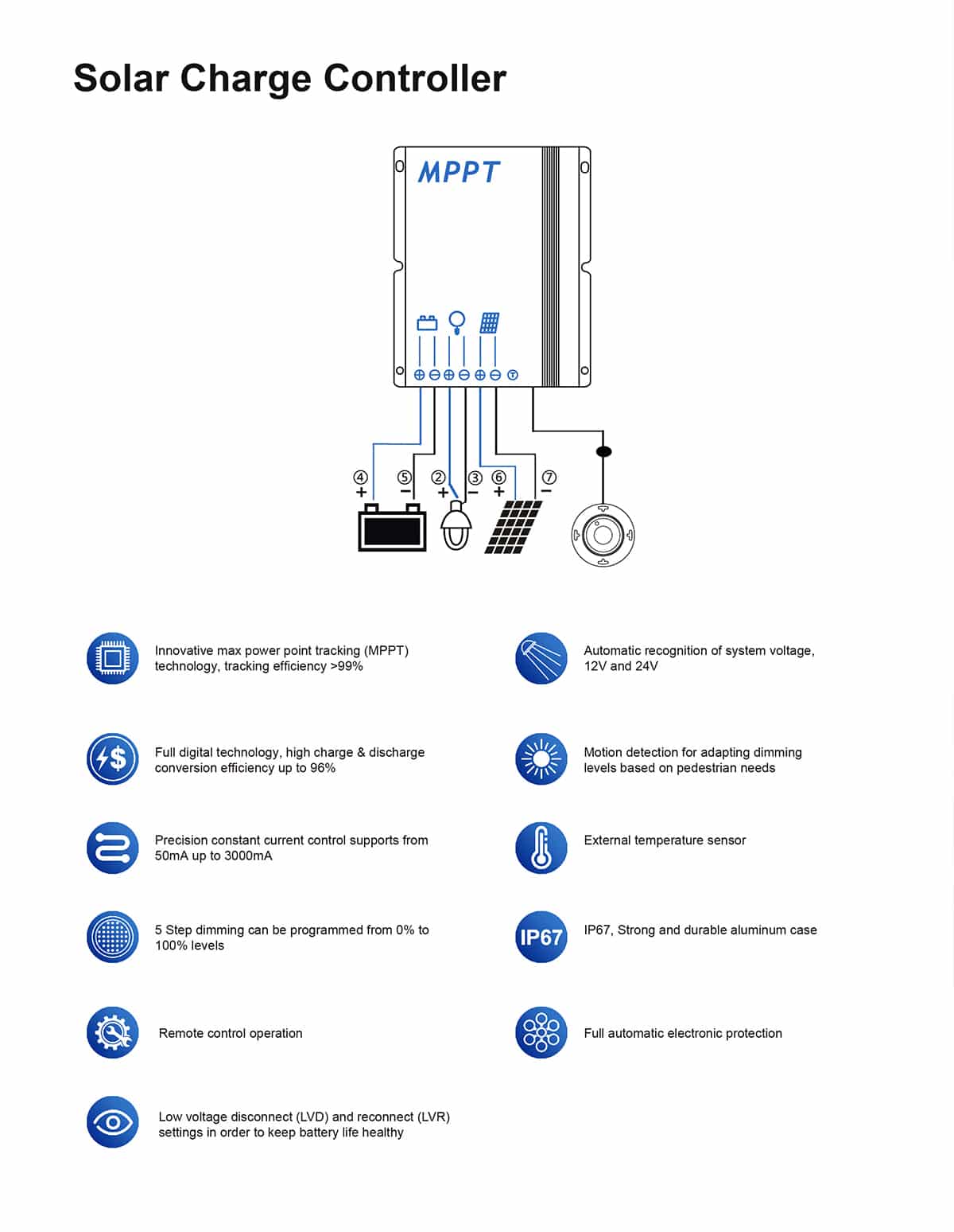 Innovative max power point tracking (MPPT) technology, tracking efficiency >99% Automatic recognition of system voltage,12V and 24V Full digital technology, high charge & discharge conversion efficiency up to 96% Motion detection for adapting dimming levels based on pedestrian needs Precision constant current control supports from 50mA up to 3000mA External temperature sensor 5 Step dimming can be programmed from 0% to 100% levels IP67, Strong and durable aluminum case Remote control operation